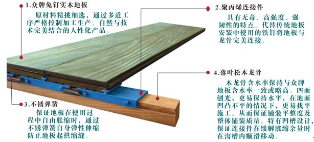 眾牌免釘?shù)匕迨菄?guó)家專利產(chǎn)品,全國(guó)前30家市場(chǎng)放心品牌,由業(yè)內(nèi)多位知名專家,經(jīng)數(shù)年實(shí)踐、研究而設(shè)計(jì)、制造的一種新型組合式實(shí)木地板。眾牌免釘?shù)匕宀捎秒p企口榫結(jié)構(gòu)、標(biāo)準(zhǔn)木龍骨、聚丙烯連接件及不銹鋼彈簧組成,在保證傳統(tǒng)實(shí)木地板優(yōu)點(diǎn)的前提下,完美無(wú)損傷安裝。 在傳統(tǒng)的實(shí)木地板安裝過(guò)程中,絕大多數(shù)產(chǎn)品均使用鐵釘、膠水等,這樣不僅會(huì)使地板本身受到損傷,且一旦鋪裝成型后,拆卸起來(lái)非常麻煩,尤其對(duì)實(shí)木地板來(lái)說(shuō),由于木頭本身所獨(dú)有的顏色,極易出現(xiàn)色差情況,如果需要調(diào)整則非常困難。而眾牌免釘?shù)匕鍏s不會(huì)出現(xiàn)這樣的情況,眾牌免釘?shù)匕逶阡佈b過(guò)程中,不使用釘子、膠水,而使用獲得國(guó)家專利技術(shù)的連接件固定,從而避免了對(duì)地板的損害,不僅比釘子更牢固,且環(huán)保無(wú)毒。另外眾牌免釘?shù)匕宀鹧b起來(lái)非常方便,搬家或者更換地板顏色都非常方便,使地板可以循環(huán)使用,保護(hù)自然資源。