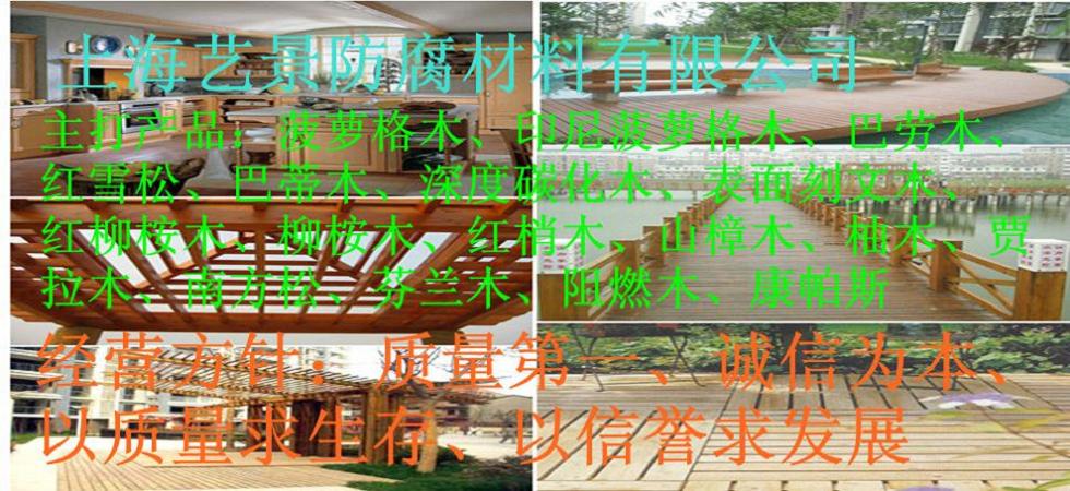 上海藝景木業(yè)有限公司是一家專業(yè)從事戶外防腐木、炭化木生產(chǎn)、銷售、施工為一體的建筑材料公司,公司長年貯備充足的原木、板材、成品防腐木以及各種進口防腐木材。 本公司經(jīng)營品種有:菠蘿格、印尼菠蘿格、非洲菠蘿格、馬來西亞菠蘿格、賈拉木、柳桉木、銀口木、梢木、巴勞木、巴蒂木、山樟木、柚木、紅鐵木、紅雪松、碳化木(炭化木)、大綠柄桑、圓盤豆、阻燃木、花旗松、防腐木、南方松、芬蘭木、等等原木及板材,可訂做(加工)特殊規(guī)格(異形)。