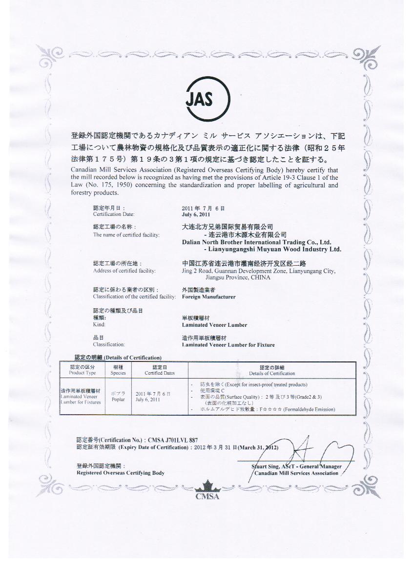 連云港木源木業(yè) 通過日本JAS LVL 認(rèn)證-連云港市木源木業(yè)有限公司
